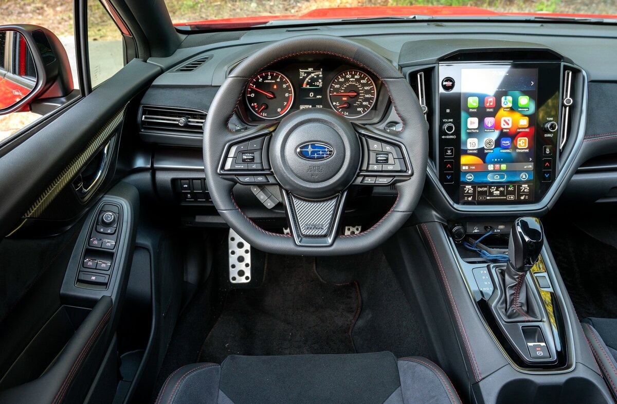 The steering wheel in the 2022+ Subaru WRX is actually a really nice piece, and it adapts well to this all-wheel drive rally-inspired supersedan. It’s got a sporty flat-bottomed shape, and it is complemented with red stitching to top it off. Since the overall design of the VB WRX is subjective, objectively Subaru has always done a great job with the steering wheel designs for all generation WRX and STI models.
