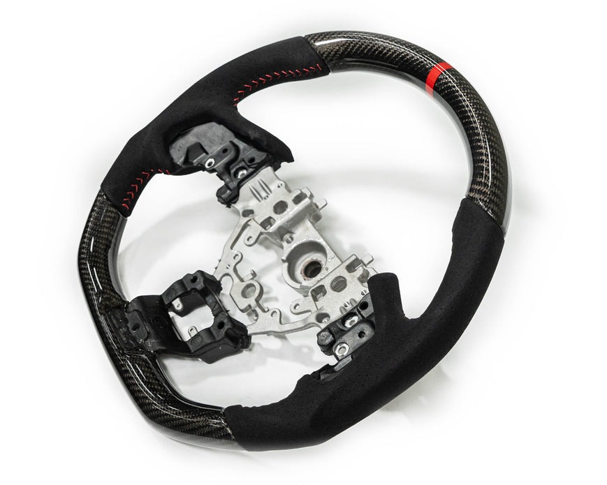 Faction Fab sources the finest of materials that demonstrate the build quality behind all their products to sustain the taxing conditions associated with racing. Faction Fab does not sleep on their steering wheels, and great proportions of leather, suede, and carbon fiber that are household options used in today’s modern upper-tier vehicles. Suede promotes better grip during those weekend track events, or if you’re dancing through your local mountain passes. Leather and carbon fiber also feel great while gripping the steering wheel to promote better responsive directional stability. Additionally, many examples will include a center-colored strip to remind the driver where the on-center position of the wheel is, while also providing the driver with a GT-3 inspired look.