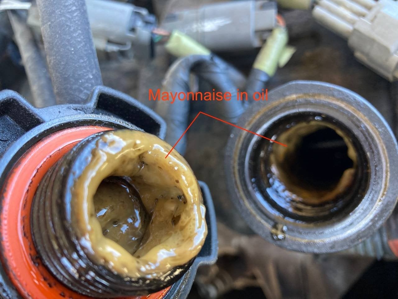 If your oil looks like a Starbucks Frappacino. Your oil should always look honey-like. Or dark after a few thousand miles. If it’s a milky light brown substance, this means that coolant has already made it into your oil. This also means that if you take your oil cap off, you will also see the same light brown milky oil as well as condensation under the oil cap because of the coolant.