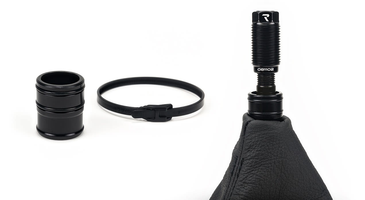 The optional shift boot retainer keeps your shift boot securely retained to the bottom of your shift knob. Simply attach your shift boot to the retainer with the supplied zip tie and slide the boot retainer into the bottom of the shift knob.
