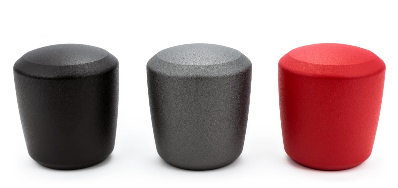 The texture finish is achieved through a meticulous powder coating process which includes multiple stages of careful hand work. The shift knobs come off our cnc machines with a super smooth surface finish, then they are gently glass beaded to promote powder coating adhesion. A coat of electrostatically charged powder is applied, then baked to cure the powder which creates a subtle textured finish for a confident shifting grip.