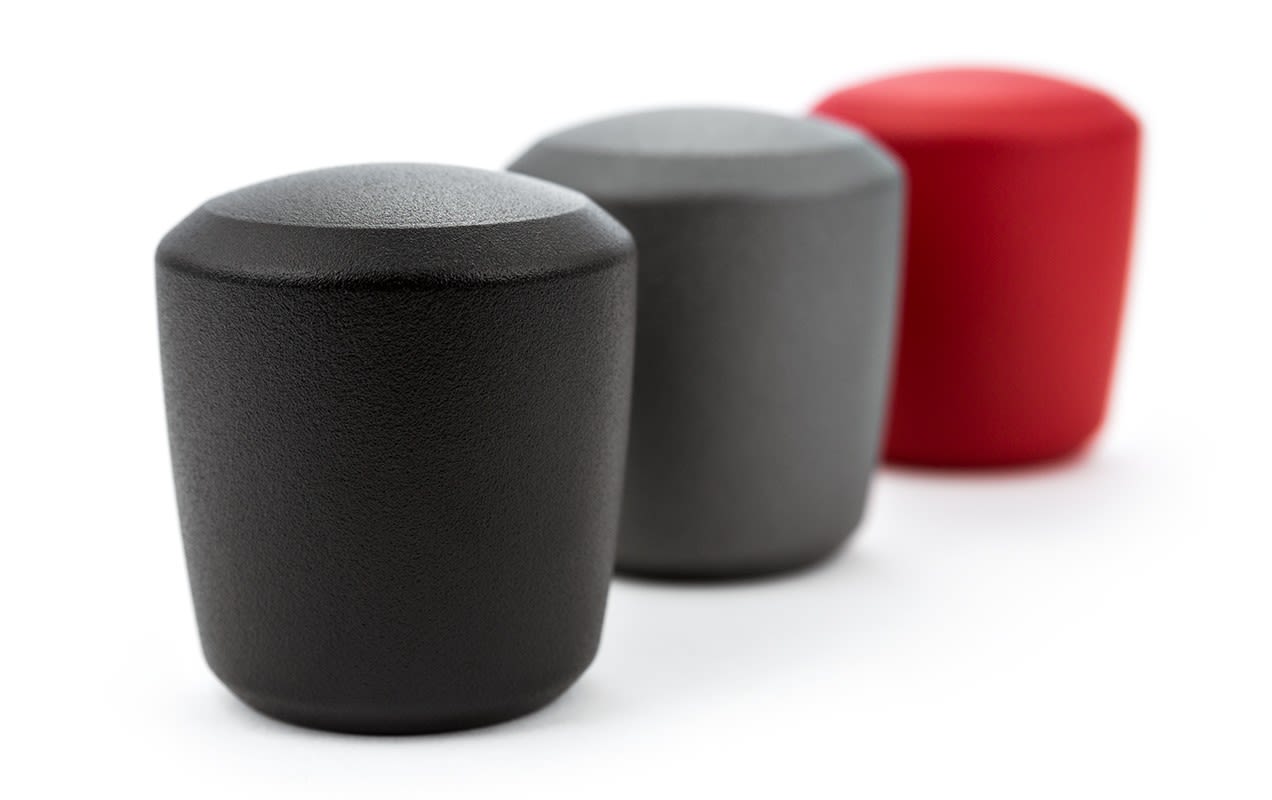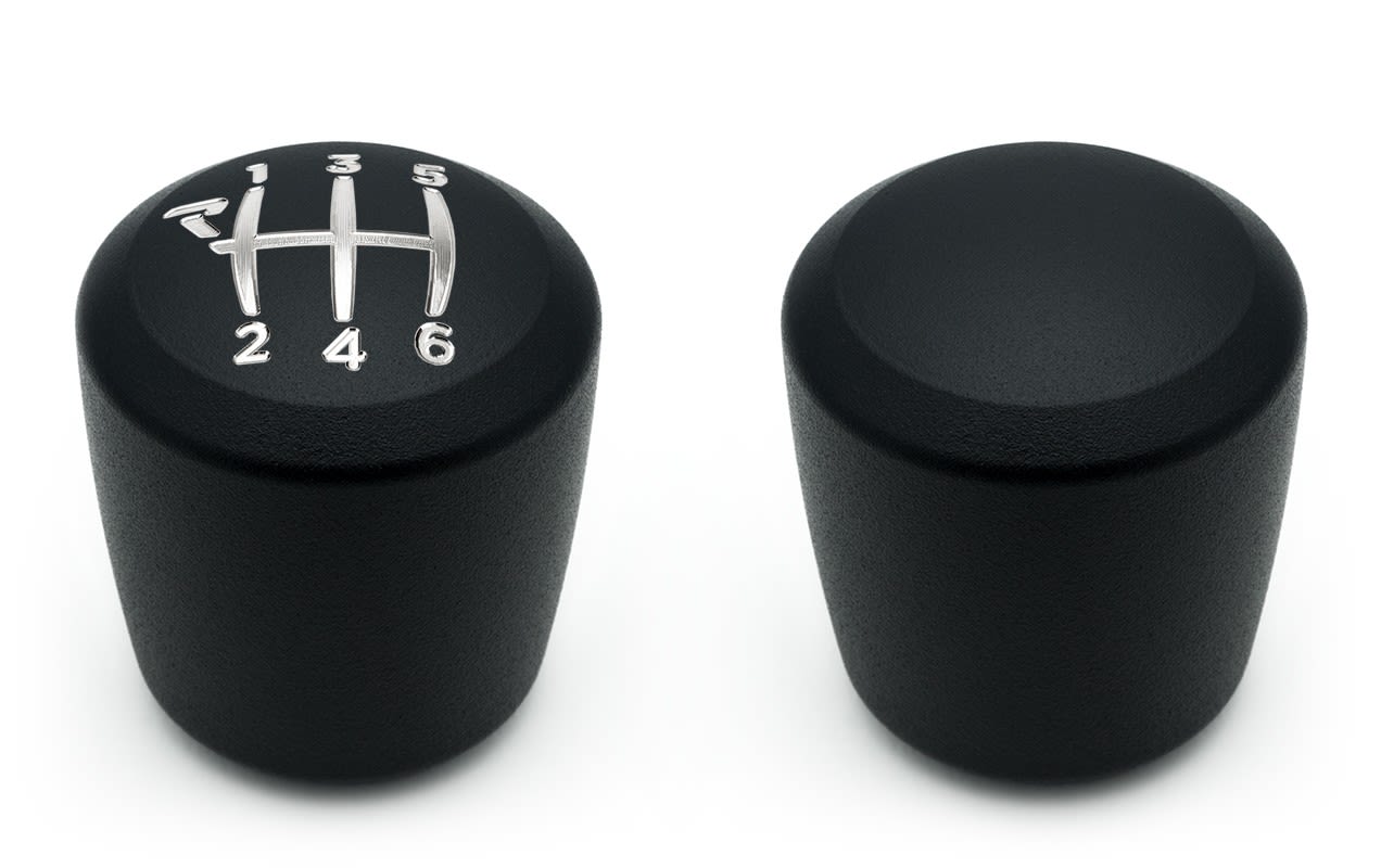 The texture finish is achieved through a meticulous powder coating process which includes multiple stages of careful hand work. The shift knobs come off our cnc machines with a super smooth surface finish, then they are gently glass beaded to promote powder coating adhesion. A coat of electrostatically charged powder is applied, then baked to cure the powder which creates a subtle textured finish for a confident shifting grip.