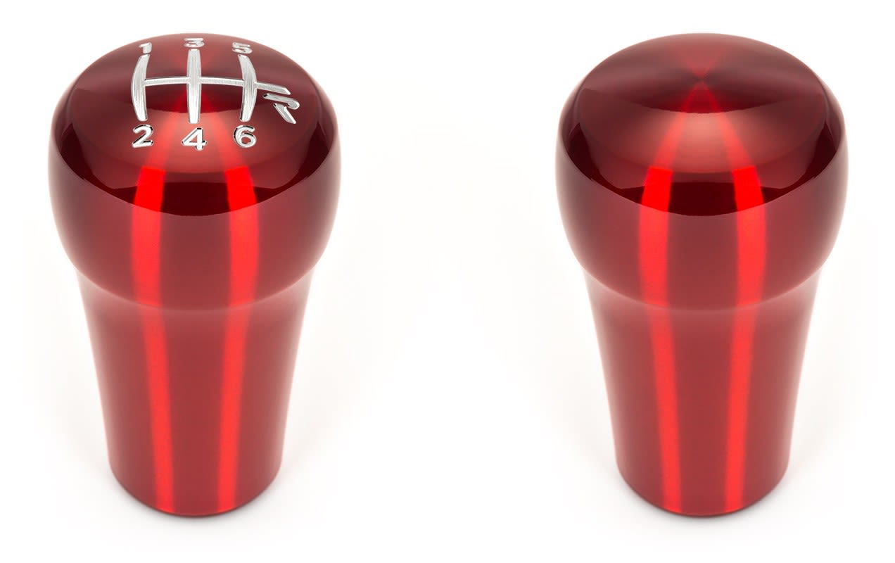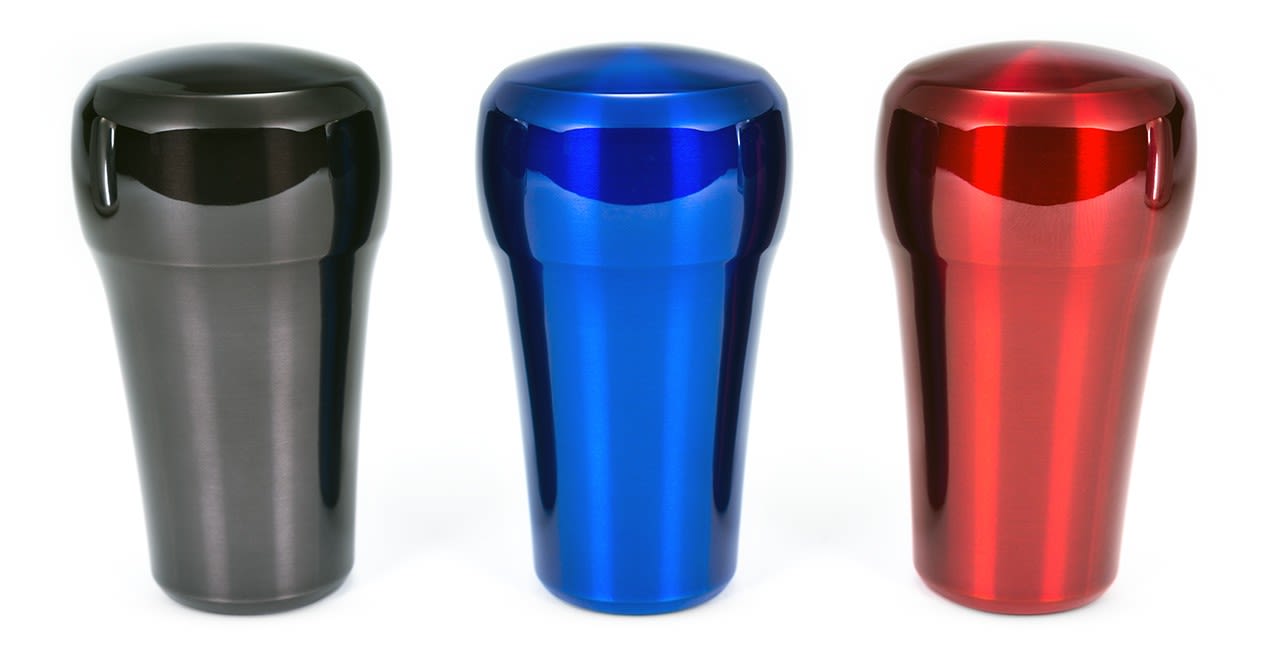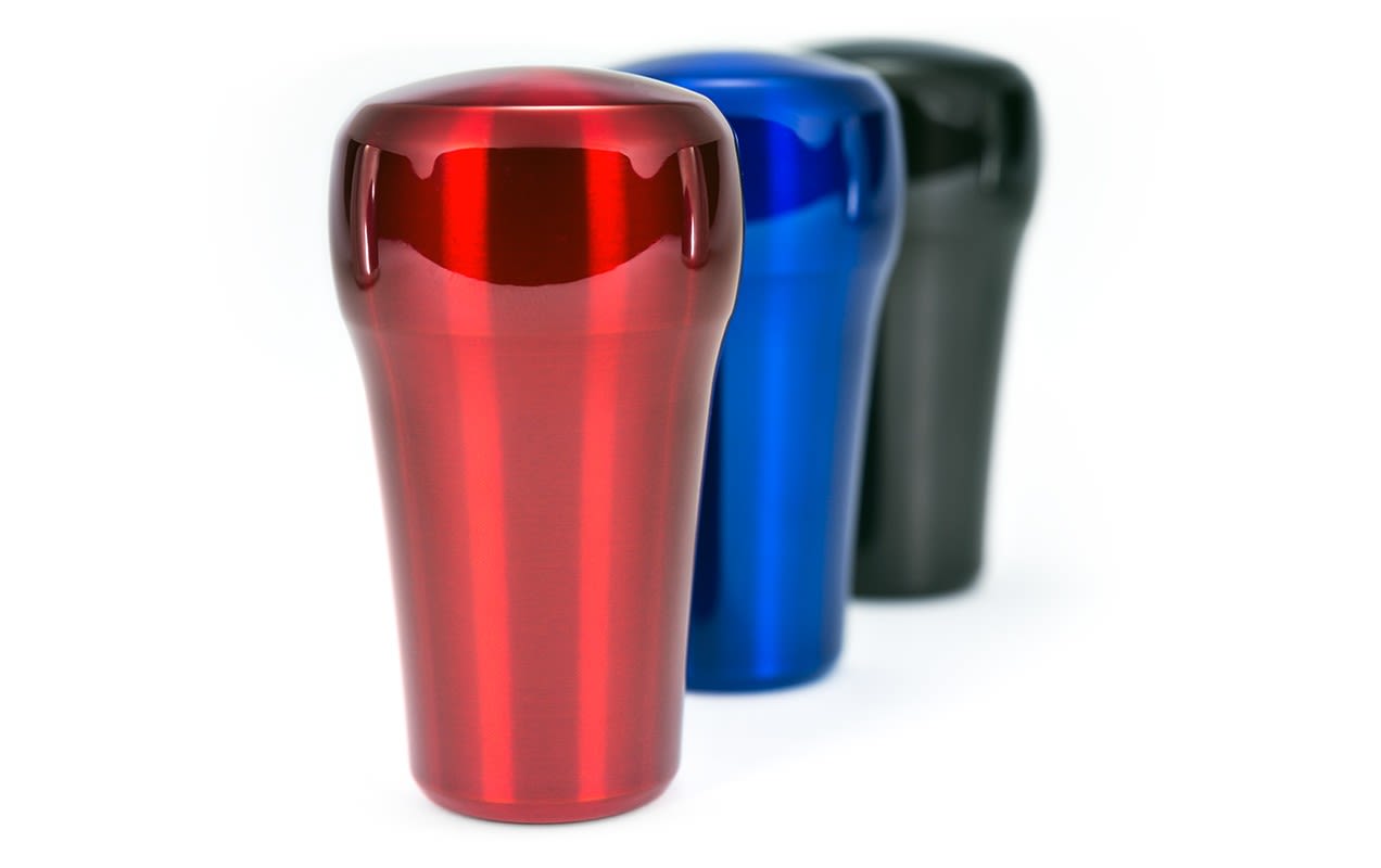 The translucent finish is achieved thru a meticulous powder coating process which includes multiple stages of careful hand work. The shift knobs are brush finished by hand to create a consistent radial grain. To achieve the translucent effect, we apply a coat of electrostatically charged clear powder that is tinted to our desired color. Then the shift knob is precisely baked at a specific temperature to create a super smooth, durable and translucent finish!