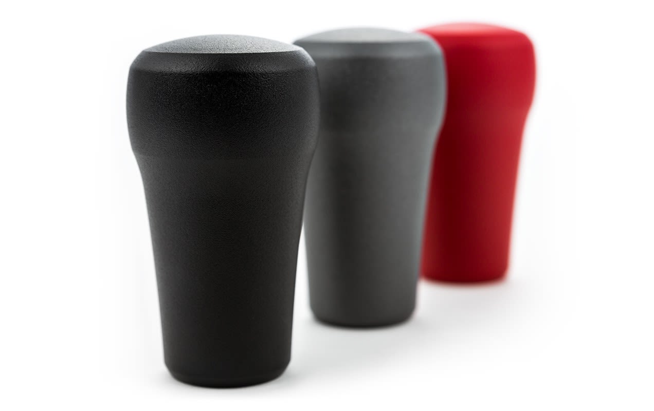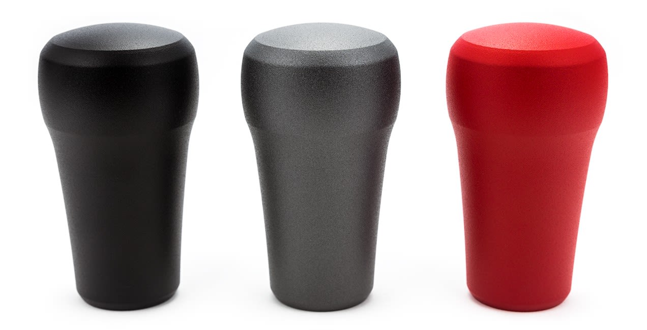 The texture finish is achieved through a meticulous powder coating process which includes multiple stages of careful hand work. The shift knobs come off our cnc machines with a super smooth surface finish, then they are gently glass beaded to promote powder coating adhesion. A coat of electrostatically charged powder is applied, then baked to cure the powder which creates a subtle textured finish for a confident shifting grip.
