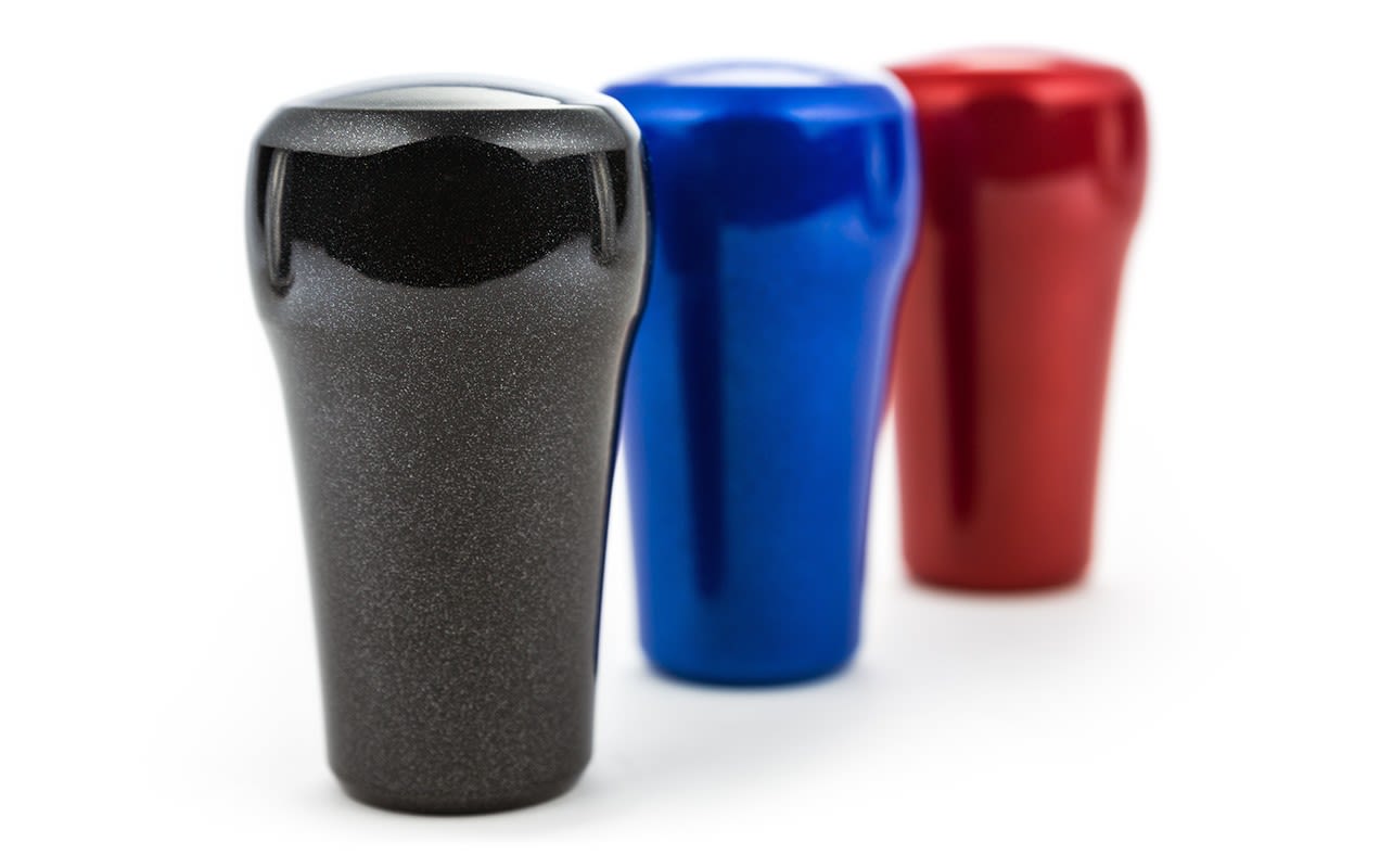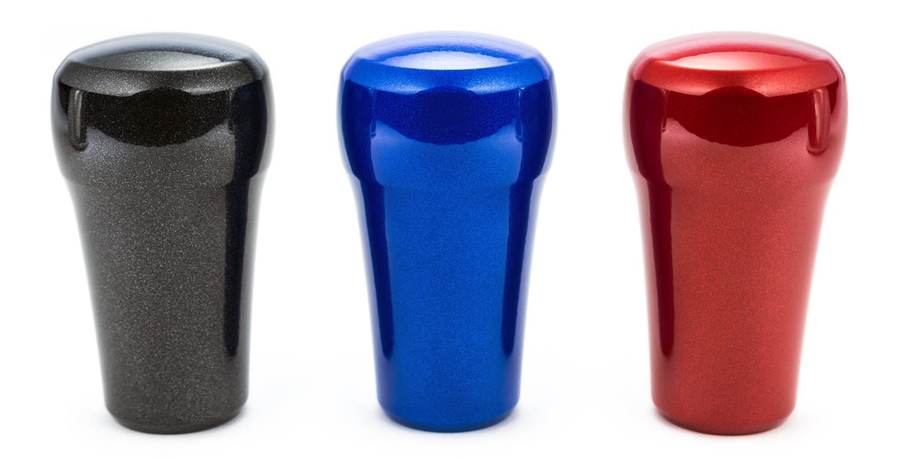 The metallic finish is achieved through a meticulous powder coating process which includes multiple stages of careful hand work. The shift knobs come off our cnc machines with a super smooth surface finish, then they are gently glass beaded to promote powder coating adhesion. A smooth coat of electrostatically charged powder is applied, then baked to cure the powder which creates a super smooth and durable finish!