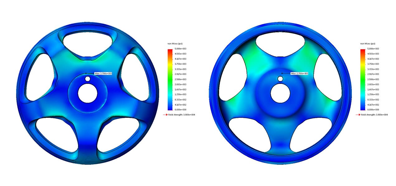 The crank pulley was run through extensive FEA simulations to determine where we could remove material without sacrificing the structural integrity of the pulley.