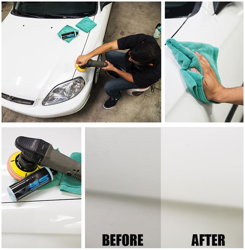 The revolutionary VSS Scratch & Swirl Remover can be used on dual-action and rotary polishers for excellent cutting and polishing ability. VSS is designed to work on all painted surfaces effectively with your pad of choice. VSS works without oils, silicone, or fillers that merely mask and cover scratches and defects. The results you see are truly the results you get. VSS maximizes efficiency by optimizing work time to deliver perfect results. VSS Scratch & Swirl Remover is VOC compliant and body-shop safe for any paint shop environment. The incredible VSS Scratch & Swirl Remover does it all. All types of paint can be successfully corrected using VSS Scratch & Swirl Remover. Remove swirls, scratches, and oxidation from any color paintwork with VSS Scratch & Swirl Remover.