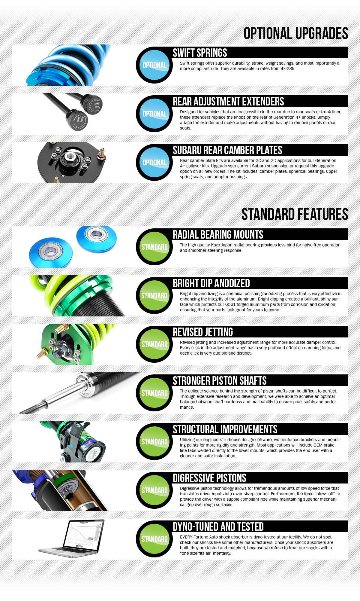 Fortune Auto is proud to release the all new Generation 5 - 510 series dampers. The advanced suspension technology found in their new dampers is derived from recent successes in World Challenge, One Lap, and Global Time Attack. All systems are completely built in house by their engineering staff in Richmond, Virginia. They insist on building bespoke suspensions in order to offer the best quality control system in the industry.