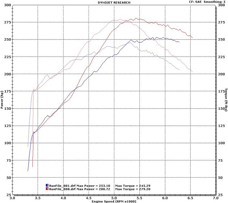 Of course, power figures vary from dyno to dyno, and actual power gains will vary from setup to setup. What's shown below are the actual before and after power curves for a Forester XT running a vf39 on an auto trans. After the first pull, the car was tuned for the GrimmSpeed TMIC, to take advantage of the additional cooling and much lower pressure drop. At 5000rpm, the car picked up an additional 35whp and 37ftlb.