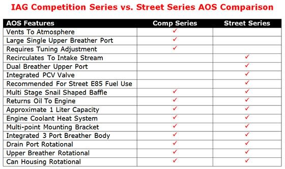 NOTE: IAG recommends the STREET SERIES AOS for ALL cars running E85 or high-ethanol fuel blends. When tuning E85, ethanol vapors tend to stay in the crankcase, which ultimately results in the oil becoming diluted and requiring extremely frequent oil changes. Pulling vacuum via the Street Series recirculating design to the inlet is ideal for ethanol tuned vehicles, and will allow the ethanol to be removed from the crankcase and burnt off as part of the combustion process.