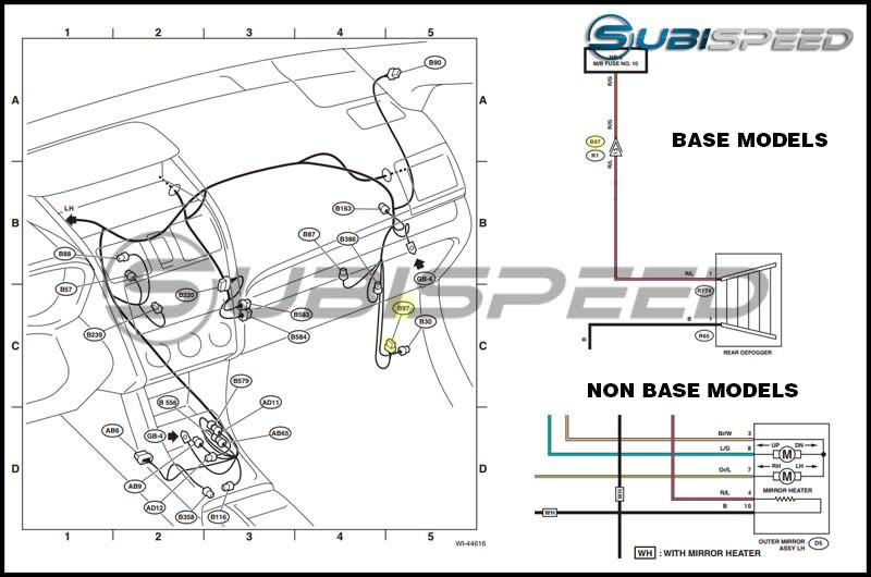 Most 2014-2018 Foresters have side mirror defrosters. For these vehicles, the defroster wires can be disconnected from the older mirrors and reattached to the new mirrors in a matter of seconds. Base owners can attach the defroster wiring (+ positive) to the red wire with green stripe at connector B97. Attach the black wire from the mirror to the chassis at any location which makes contact with the body (- ground).
